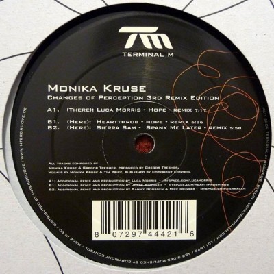 März 29 , 2016 TERM066 – Monika Kruse – Changes Of Perception RMX A1 Hope (Luca Morris Remix) 7:17 B1 Hope (Heartthrob Remix) 6:26 B2 Spank Me Later (Sierra Sam Remix) 5:58